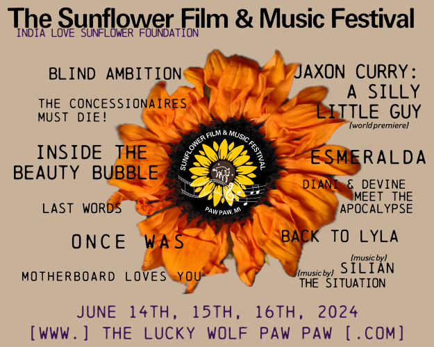 Announcing the first annual Sunflower Film & Music Festival, June 14-16 at The Lucky Wolf, in Paw Paw, Michigan. Sunflowers are hyperaccumulators—plants that have adapted to thrive in environments with high concentrations of toxic materials. This festival will celebrate creativity’s ability to flourish and give back truth and beauty, even as it absorbs and faces up to the destructive elements of the cultures from which it arises. In doing this, Sunflower Film Fest will continue to honor India Summer Deibler- Love’s mission and vision of creating inclusive, nurturing spaces that bring community of all walks of life together for positive experience through art, music, and great coffee & wine.